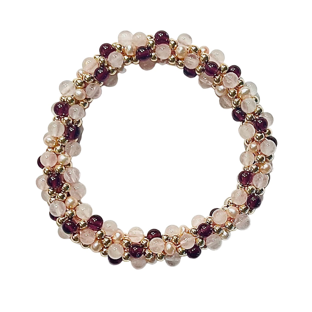 Made with 14kt Yellow Gold Filled, Garnet, Rose Quartz & Fresh Water Pearls.